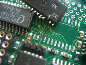 Ces deux pistes sont particulières : elles sont connectées sous le composant. Il est tout à fait possible de prolonger les pistes restantes au niveau de l'ancienne pastille, mais lors du soudage sur la tige du composant, la chaleur pourrait alors dessouder cette frêle fixation. Rappel : les pistes font 0.1 ou 0.2 mm et ont donc une surface de soudure très faible :