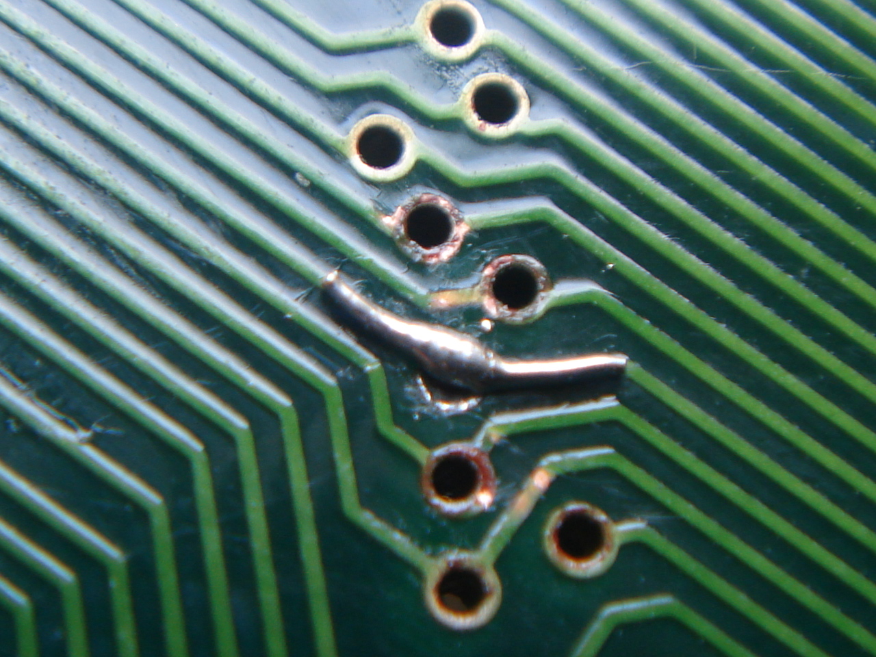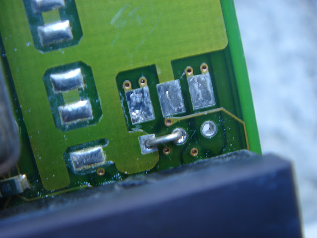 Il suffit de relier les deux faces de la carte avec un câble assez fin, et de souder ensuite pour refaire les connexions :