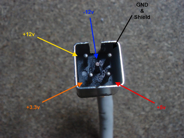 Sur la carte de l'Amiga 1200, le Shield et la GND de la prise alim sont communs mais sur deux pinoches distinctes. Son capot en plastique a donc été ôté en découpant simplement une fente verticale dans sa tranche pour ainsi regrouper le Shield et la GND en un seul conducteur dans le câble :