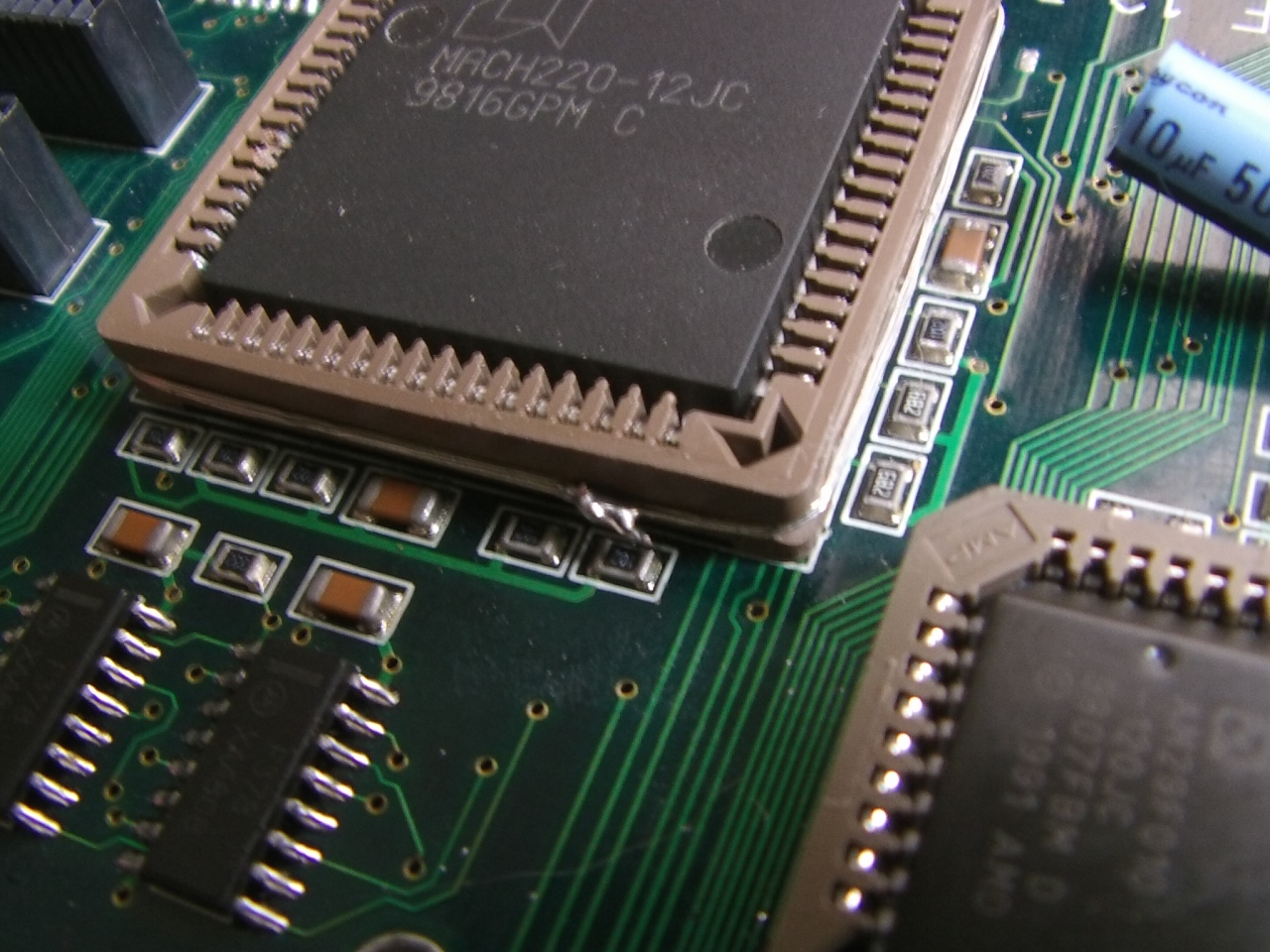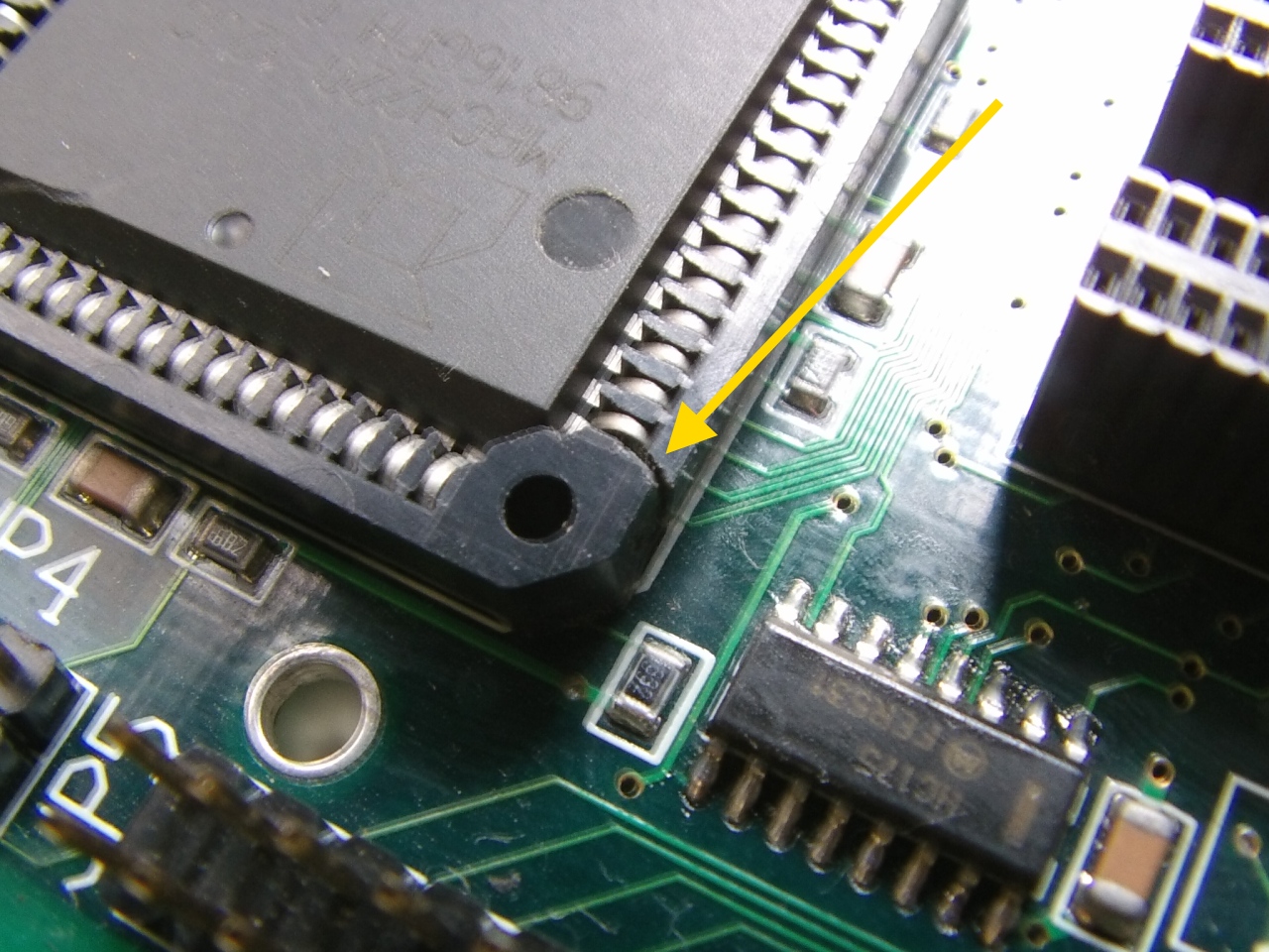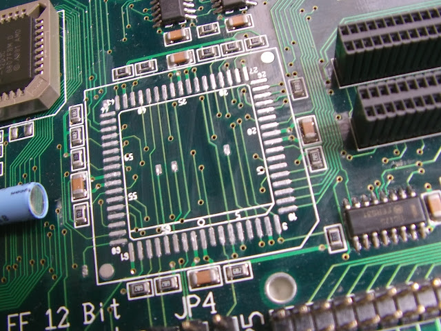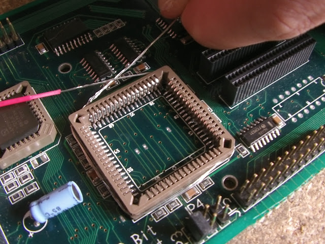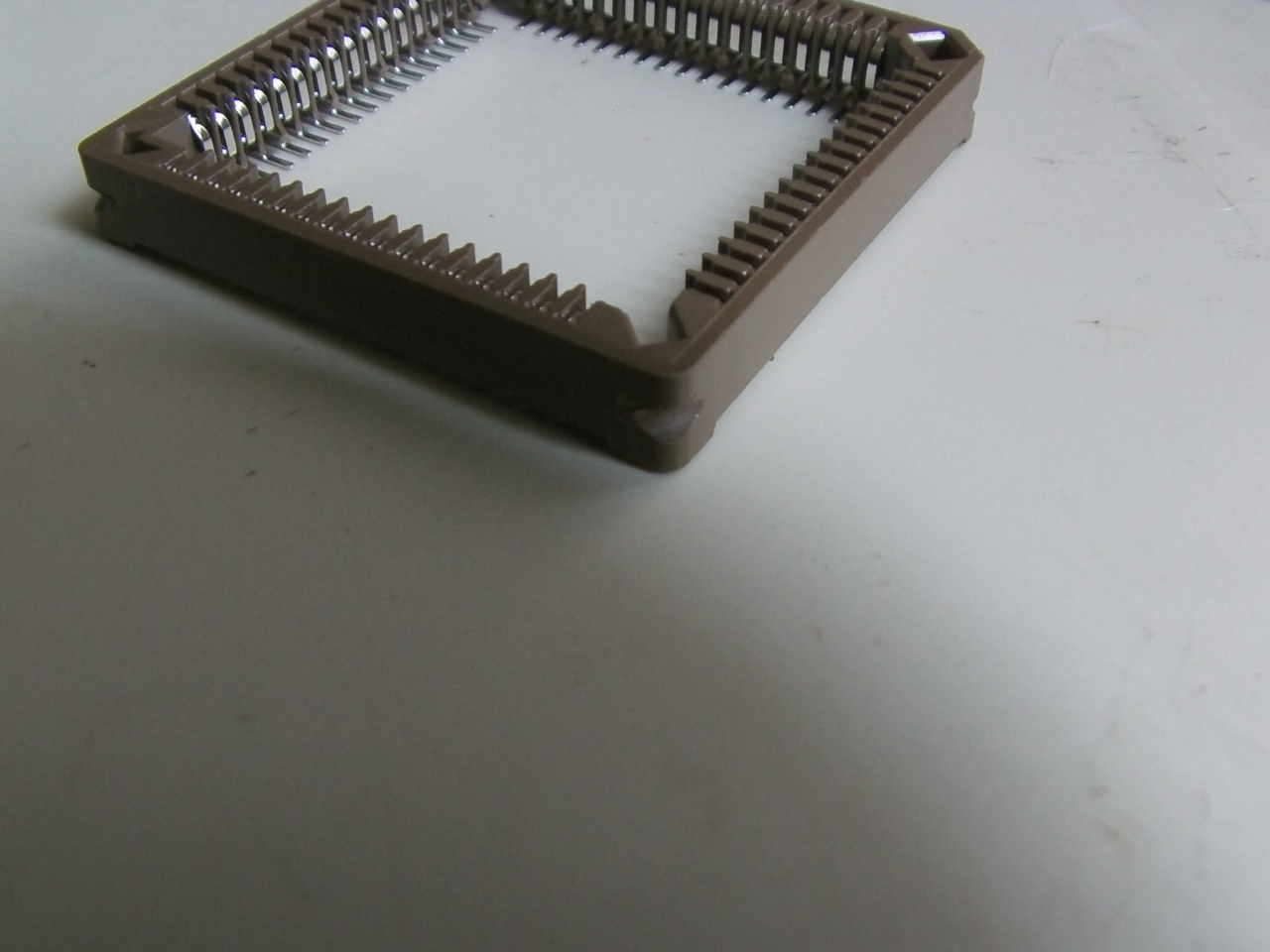 Les supports neufs PLCC 68 broches sont arrivés hier à la maison. Avant de le souder, faisons une encoche aux quatre coins comme ceci :
