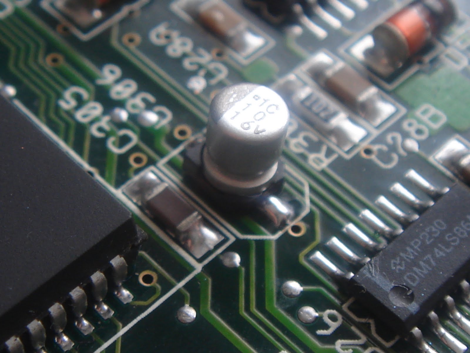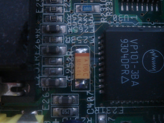 Certains vieux condensateurs se mettent à couler sur la carte, comme celui-ci sur une de mes Game Gear de Sega, produite en 1990 :